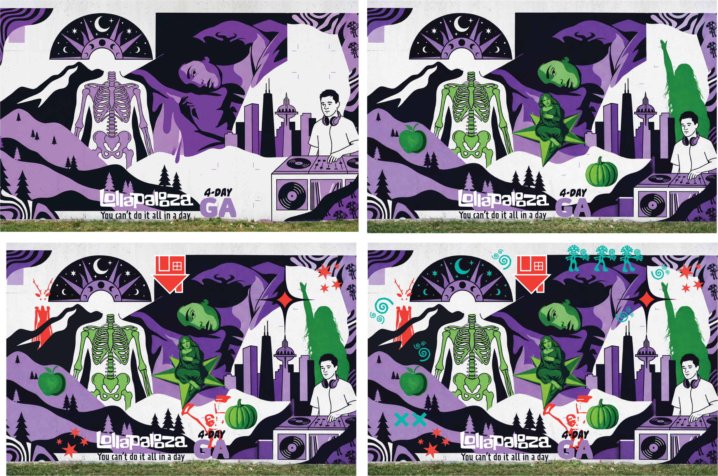 To announce this year’s headliners, we’re tapping Chicago native and renowned mural artist, Jeff Zimmerman, to paint a mural over the span of four days. Each day, a new color is added to the mural – Purple for Thursday’s headliner, Green for Friday’s, Red for Saturday’s, and Blue for Sunday’s. For four days, Chicagoans will see Lolla’s lineup come to life in real time.